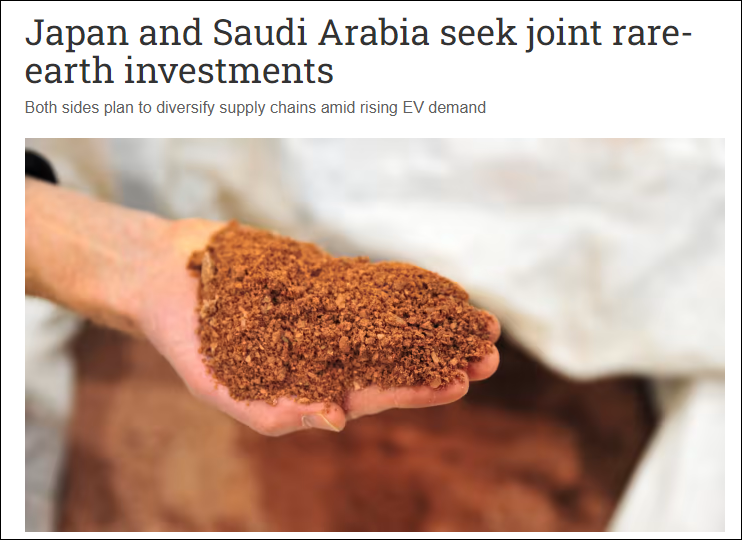 报道称,目前世界上大部分稀土由中国等少数国家供应,比如电动汽车电池中使用的元素锂和钴。日本和沙特致力于实现此类金属供应链的多元化,避免过度依赖任何特定供应商。