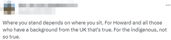 有网友评论:“立场如何取决于你坐在哪里。对于霍华德和所有有英国背景的人来说,这是真实的。对于原住民来说,并非如此。”
