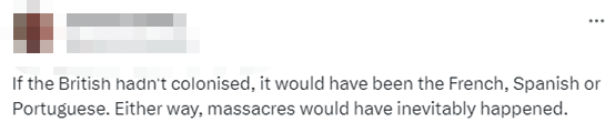 另一方面,也有网友认为:“如果没有被英国人殖民,那就会是法国人、西班牙人或者葡萄牙人了。无论哪种方式,大屠杀都会不可避免地发生。”