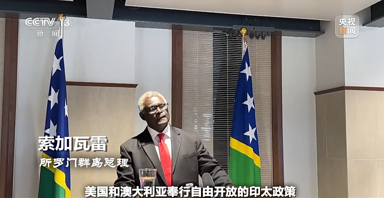 所罗门群岛总理 索加瓦雷:女士们,先生们。美国和澳大利亚奉行自由开放的印太政策,这就意味着(两国)应尊重国际法、别国主权,不要干涉别国决定自己政治道路的权利。(美国)对所罗门群岛对华政策方案的质疑,扭曲了这一所谓“自由开放”的印太政策。