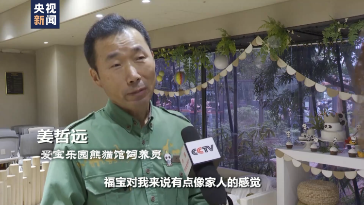 爱宝乐园熊猫馆饲养员 姜哲远:福宝对我来说有点像家人的感觉,我在动物园已经工作了30多年。这样看来,动物们就是我的朋友。我们的宝家族真的有家人的感觉,首先爱宝、乐宝、福宝的名字都是有含义的,就像它们名字的意思一样,它们是可爱又给我带来快乐的宝物。可爱的宝物还有幸福的宝物,对我来说,它们是熊如其名,像家人一样的宝贝。