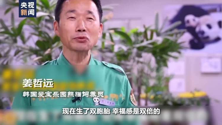 韩国爱宝乐园熊猫饲养员 姜哲远:生福宝的时候是一只,现在生了双胞胎,幸福感是双倍的。