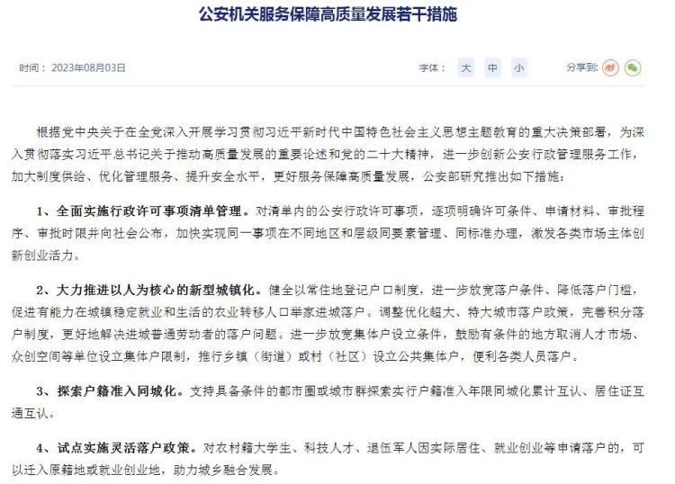 8月3日,公安部发布公安机关服务保障高质量发展若干措施,其中在户籍政策方面提出一系列举措。