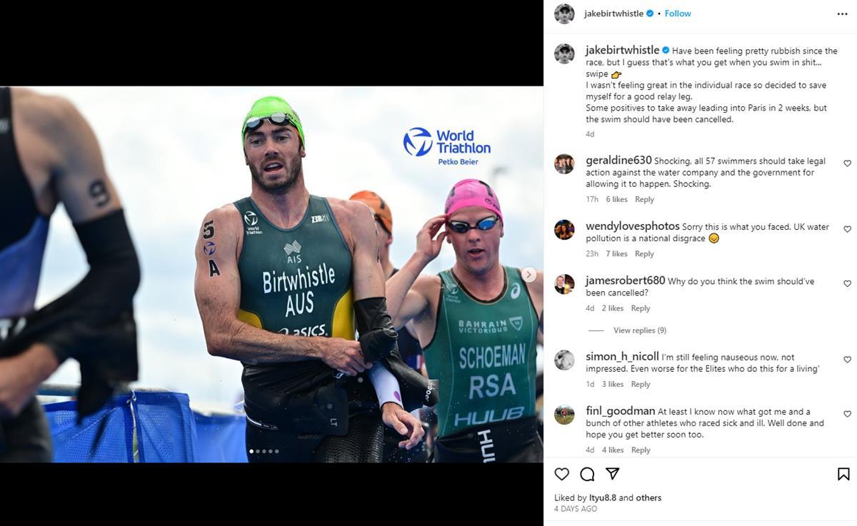 澳大利亚顶级运动员杰克·伯特惠斯特尔曾在全球多个铁人三项比赛中夺冠,他在Instagram上写道:“比赛完,我一直感觉非常糟糕。我猜这就是在‘屎’里游泳的结果。”