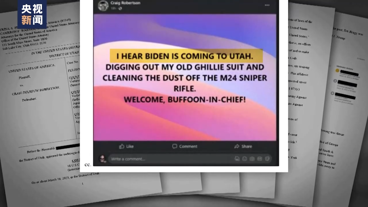 据美国媒体报道,在拜登本月早些时候访问犹他州前夕,克雷格·罗伯逊在网上写道:“听说拜登要来犹他州。我要找出我的旧迷彩服,擦干净狙击步枪。”这名男子自称是特朗普的支持者,他威胁除掉的民主党政客也不止拜登一人,还包括副总统哈里斯、司法部长梅里克·加兰,以及对特朗普发起指控的检察官等人。美国有线电视新闻网就称,这起事件是美国越来越令人担忧的充满暴力威胁的政治环境的一部分,代表了一种令人不安的趋势。