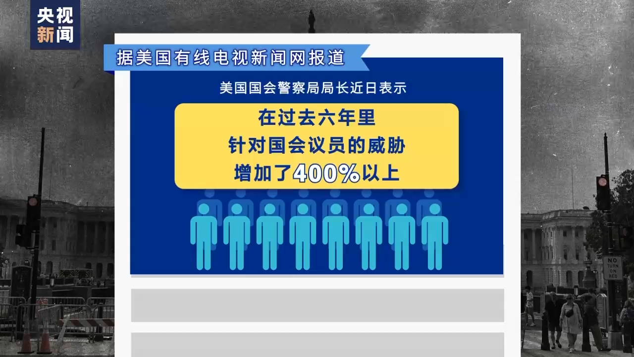据美国有线电视新闻网报道,美国国会警察局局长近日表示,在过去六年里,针对国会议员的威胁增加了400%以上。国会警察局2022年的报告指出,该部门2021年处理的国会议员受威胁案件约9600件,而在2017年约为4000件,4年的时间增长了百分之140%。美国全国城市联盟在2021年的报告中指出,81%经选举产生的地方官员报告遭遇过政治威胁,87%认为情况越来越糟。