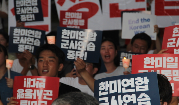 当天参与集会的市民点燃蜡烛,手举“朝鲜半岛不能再起战争”“反对韩美日军事同盟”等标语,并高喊“中断韩美战争演习”的口号。