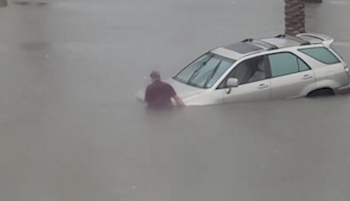 海外网8月22日电 据美国《纽约邮报》8月21日报道,热带风暴“希拉里”20日起侵袭美国加利福尼亚州南部,导致当地遭遇猛烈山洪。为了躲避危险的洪水和泥石流,惊慌失措的民众不得不爬上树,一些人还放弃了自己困在水中的汽车。