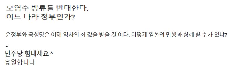 不过,对韩国政府和执政党的表态,一些韩国网民并不买账。一些人写道,“尹锡悦政府和国民力量党将会为他们与日本的罪行共同承担历史的代价”“你们到底是哪国政府,民众可在反对核污染水排放”等等。不少网友表示支持共同民主党,有人留言“民主党为了守护国民健康辛苦了”“民主党加油”,也有人说“弹劾执政党是最好的方式”。