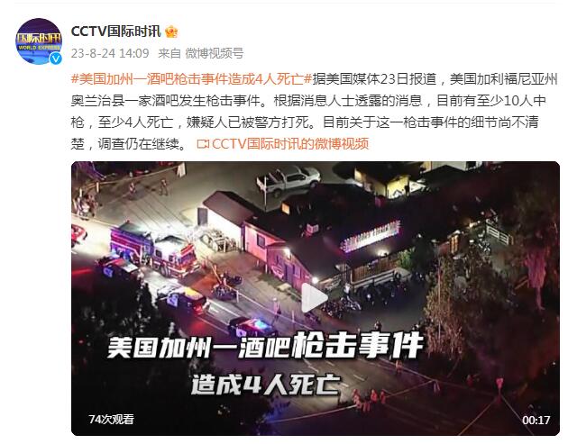 据美国媒体23日报道,美国加利福尼亚州奥兰治县一家酒吧发生枪击事件。根据消息人士透露的消息,目前有至少10人中枪,至少4人死亡,嫌疑人已被警方打死。目前关于这一枪击事件的细节尚不清楚,调查仍在继续。