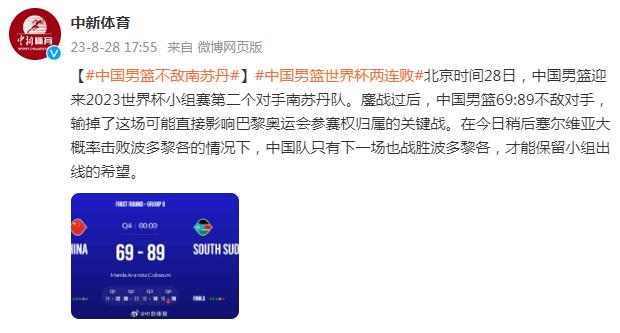 北京时间28日,中国男篮迎来2023世界杯小组赛第二个对手南苏丹队。鏖战过后,中国男篮69:89不敌对手,输掉了这场可能直接影响巴黎奥运会参赛权归属的关键战。在今日稍后塞尔维亚大概率击败波多黎各的情况下,中国队只有下一场也战胜波多黎各,才能保留小组出线的希望。