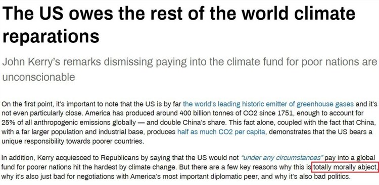 对此,美国记者、专栏作家和政治评论员布拉德利·布兰肯希普在题为《美国欠世界其他国家气候赔款》的文章中指出,美国是全球有史以来排放温室气体最多的国家。这一事实本身就表明,美国对贫穷国家承担着绝无仅有的责任。然而为了政治需要,克里却称美国“在任何情况下”都不会向受气候变化影响最严重的贫穷国家做出赔偿,这是“彻头彻尾的肮脏卑鄙”。