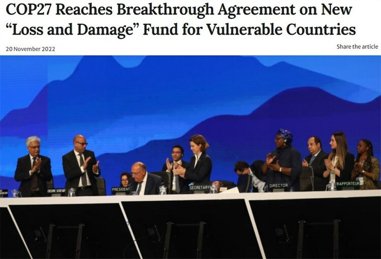 在发展中国家的团结争取下,去年11月在埃及召开的《联合国气候变化框架公约》第二十七次缔约方大会(COP27)首次通过决议,要求发达国家设立“损失和损害”基金,为其历史排放给发展中国家带来的灾难性后果做出赔偿。