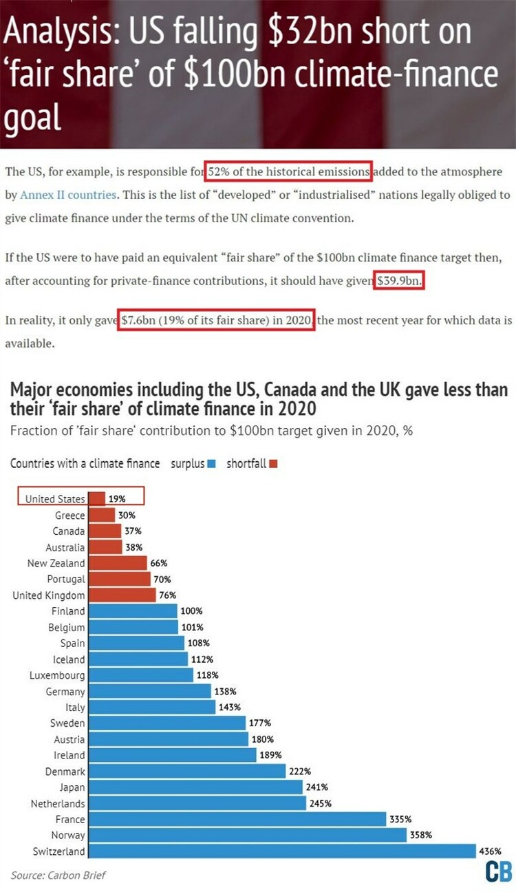 英国能源研究机构发布的数据表明,按照历史碳排放份额计算,美国每年应提供399亿美元气候援助资金,但2020年只提供了76亿美元,仅占应分摊份额的19%,是23个相关发达国家中贡献最少的一个。