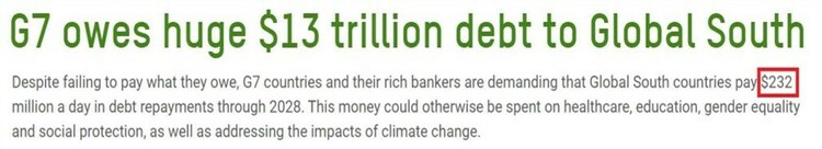 国际慈善组织乐施会在今年5月七国集团(G7)峰会举行前夕公布的报告显示,迄今为止,G7不仅仍有约13万亿美元的发展和气候援助没有兑现,而且还反过来要求全球南方国家在2028年前每天偿还2.32亿美元的债务。