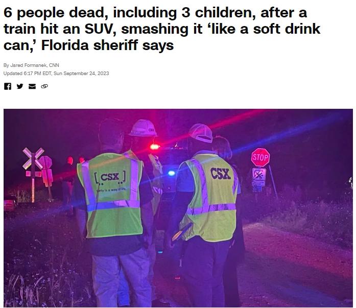中新网9月25日电 据美国有线电视新闻网(CNN)24日报道,当地时间23日晚,美国佛罗里达州希尔斯伯勒县一列火车在经过铁路口时与一辆SUV汽车相撞,造成6人遇难,其中包括3名儿童。