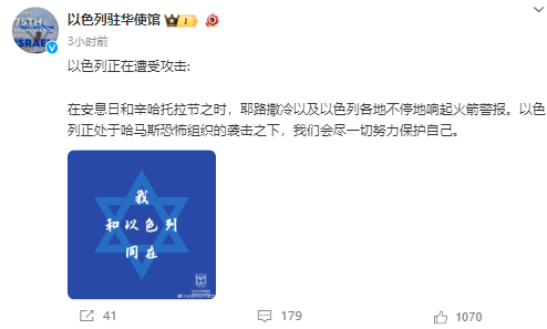 北京时间7日下午,以色列驻华使馆在其微博账号发布图文信息,第一条微博中称“以色列正在遭受攻击:在安息日和辛哈托拉节之时,耶路撒冷以及以色列各地不停地响起火箭警报。以色列正处于哈马斯‘恐怖组织’的袭击之下,我们会尽一切努力保护自己。”