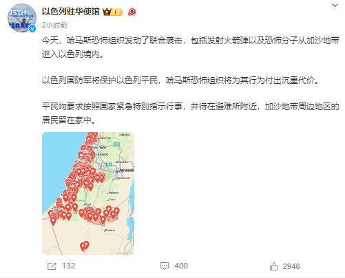 约一个小时后,该账号再次发布微博,称“今天,哈马斯‘恐怖组织’发动了联合袭击,包括发射火箭弹以及‘恐怖分子’从加沙地带进入以色列境内。”接着,贴文称,“以色列国防军将保护以色列平民,哈马斯‘恐怖组织’将为其行为付出沉重代价。平民均要求按照国家紧急特别指示行事,并待在避难所附近,加沙地带周边地区的居民留在家中。”该条微博下方,以色列驻华使馆配上了一张事发地区地图,图上有很多定位点。