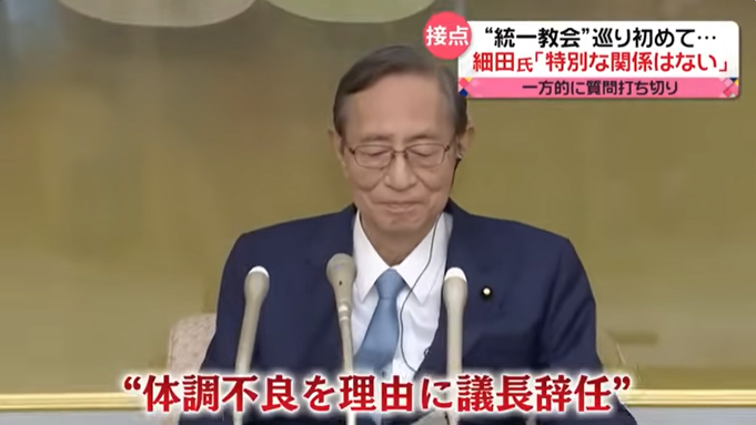 细田在记者会上表示,决定辞去众议院议长职务。他此前被曝出曾在“统一教”相关活动上发表过讲话,也出席过该教派会议。在13日的记者会上,细田始终没有正面回应相关问题。此外,他还深陷“性骚扰”丑闻,被曝出曾向多名女记者询问私生活情况。有记者就此向他提问,他反驳称,“如果是在性骚扰前提下的提问,我也要以‘没有此事’为前提来回答。”
