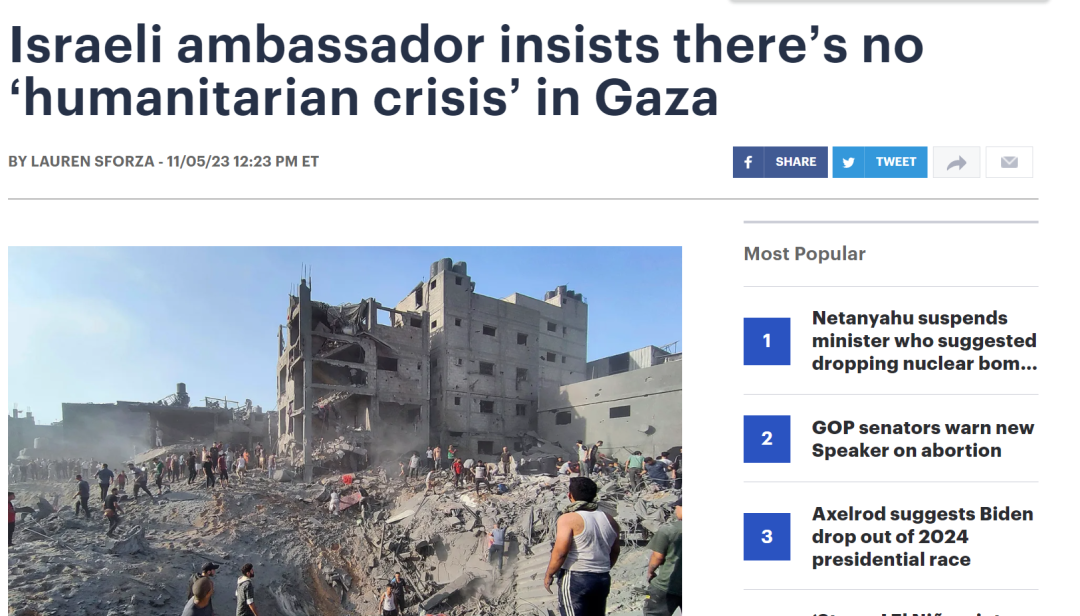 据美国《国会山报》5日报道,尽管加沙地区的燃料、水和医疗用品短缺,而且国际援助组织警告说,由于以色列的袭击这块飞地的局势变得一天比一天更严峻,但以色列驻联合国代表坚称,加沙当地并不存在“人道主义危机”。