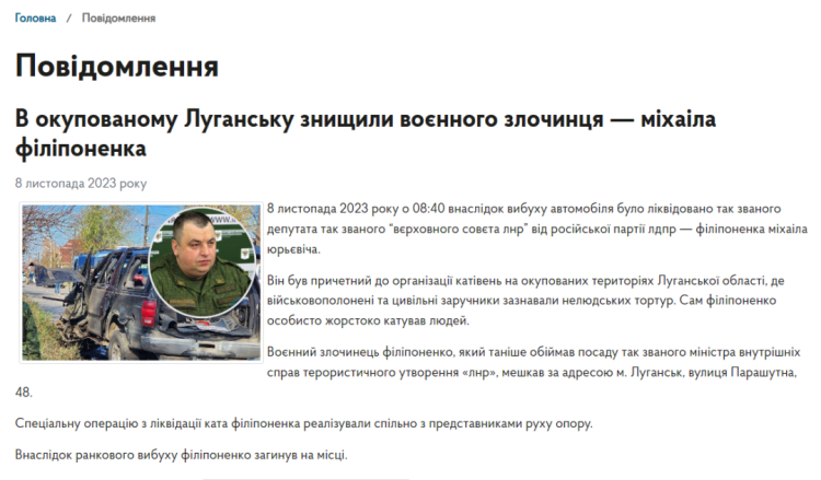 11月8日,卢甘斯克地区地方议员、当地民兵武装高层米哈伊尔·菲利波年科在汽车炸弹袭击中丧生,乌克兰国防情报总局当天在官网发布声明,宣布对此事负责。