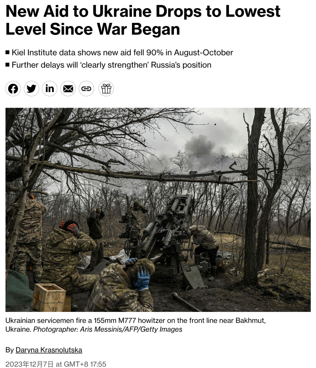基尔世界经济研究所表示,“(盟友)对乌克兰的支持力度已经放缓”,2023年8月至10月期间,各国承诺向乌克兰提供的军事、财政和人道主义援助为21.1亿欧元,与2022年同期相比下降了近90%,跌至2022年2月俄乌冲突爆发以来的最低点。