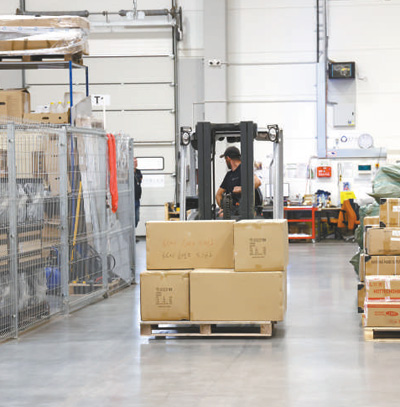 在SYMLOG国际货运公司主仓库内,工作人员进行货物装卸。