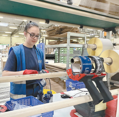 波兰边境城市斯武比采是欧洲陆路交通重要口岸。图为在当地一家海外仓内,工作人员正扫描商品,重新分装打包。