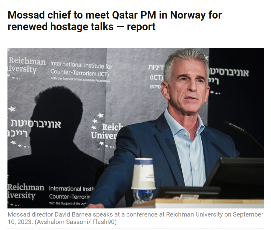 据《以色列时报》12月16日报道,美国《华尔街日报》爆料称,以色列情报机构摩萨德负责人大卫·巴尔内亚将于当天晚些时候在挪威与卡塔尔首相兼外交大臣穆罕默德举行会谈,就寻求重启巴以冲突双方停火谈判事宜进行协商。