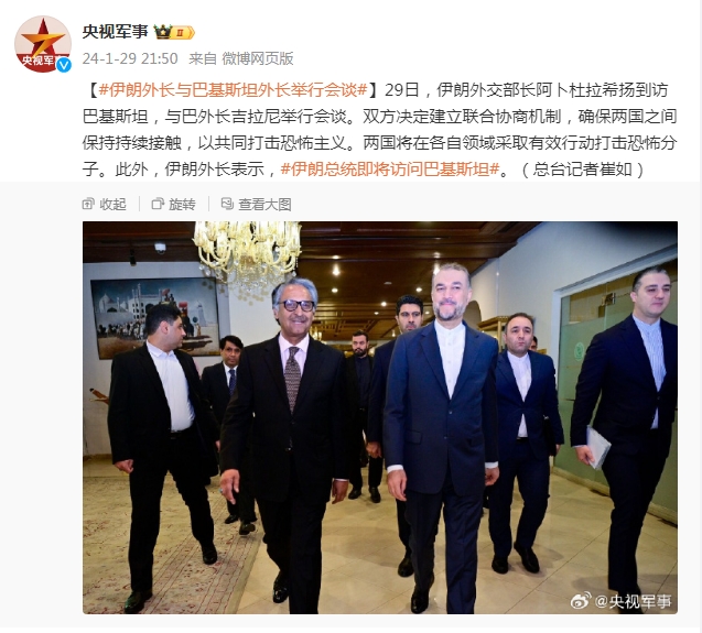 29日,伊朗外交部长阿卜杜拉希扬到访巴基斯坦,与巴外长吉拉尼举行会谈。双方决定建立联合协商机制,确保两国之间保持持续接触,以共同打击恐怖主义。两国将在各自领域采取有效行动打击恐怖分子。此外,伊朗外长表示,伊朗总统即将访问巴基斯坦。(总台记者崔如)