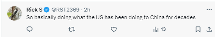 对于克里斯托弗·雷上述言论,在社交媒体X上有网友并不赞同。有人讽刺说:“所以基本上是在做美国几十年来一直在对中国做的事情。”↓