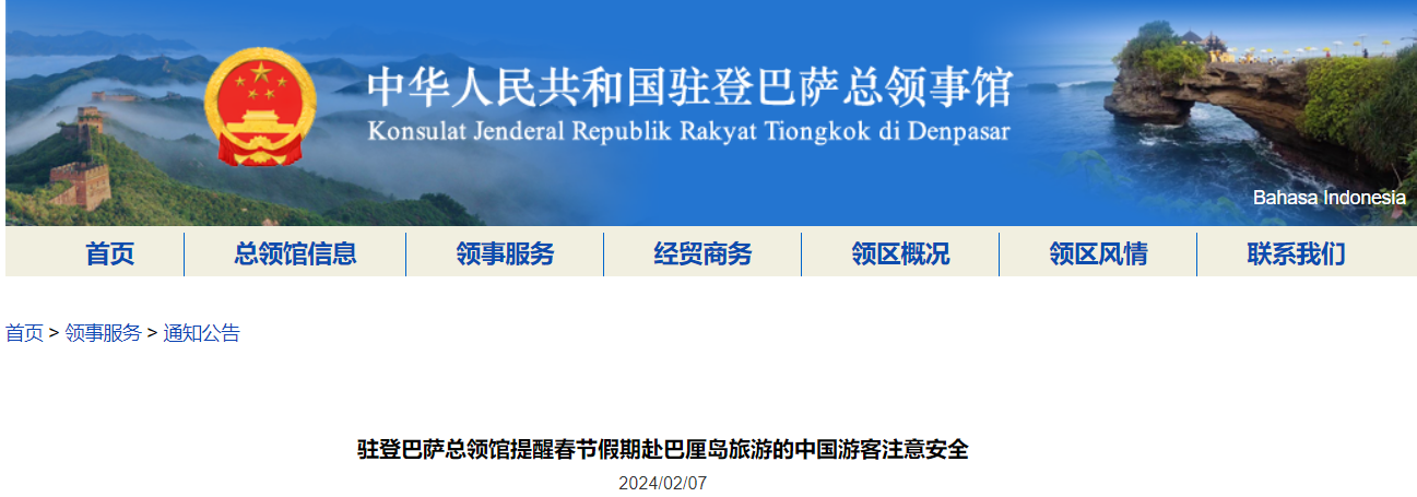 龙年即将到来,驻登巴萨总领馆预祝大家龙行龘龘,前程朤朤!谨提醒春节假期赴巴厘岛旅游的中国游客注意以下事项: