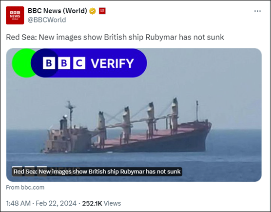 在报道原文中,BBC表示自己收到了2张分别拍摄于20日和21日的照片,照片中船只已因严重损毁并在海中呈倾覆状,但部分船体仍在水面上。BBC表示,这艘船只从外观看可基本确认为“红宝石”号,而这两张图片显示该船“并未沉没”。