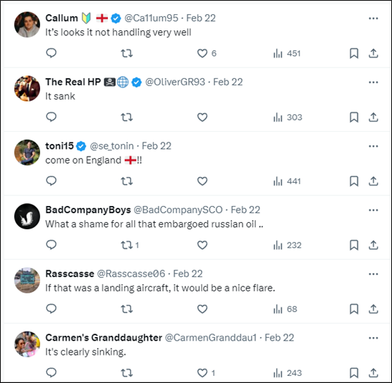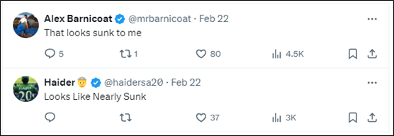 有网友表示,在自己的理解里,这艘船已经是“沉了”,也有网友故意开玩笑反讽说“这船看着好像很完好”,还有人替BBC纠正了下措辞,称这艘船“正在下沉”。也有不少网友吐槽:“这条新闻真棒”“可真是要谢谢你的分享呢”。