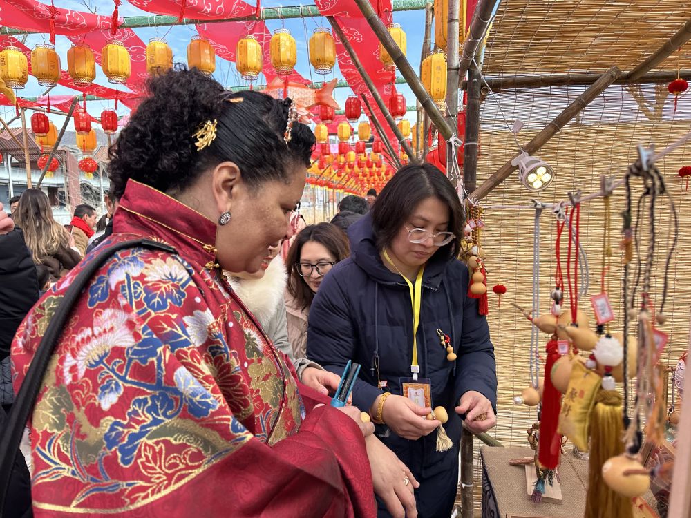 游园会上,古香古色的展位布置、国潮风格的灯笼帷幔、琳琅满目的各色商品、诱人的美食小吃,让人一秒穿越时空,回溯古代集市的盛景。在剪纸、京绣、葫芦雕刻等非遗文化摊位前,外交官们流连忘返,久久驻足,感受“中国范儿”的传统年味。“京西物语”摊位前人头攒动,使团成员们被“长城砖”“琉璃兽”等文创产品的魅力所吸引。特色小吃的摊位上,元宵、糖葫芦等美食成为了集市上的抢手货。