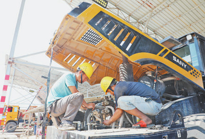 到了饭点,项目部修理厂厂长张红山抓紧时间扒了两口饭,就往工地赶去。他主要负责工地上机械设备的维修。吃饭前,他得知工地上一辆小型振动碾坏了,为了不耽误下午施工,他想利用午休时间把机器修好。张红山的徒弟塔尼在旁边协助。