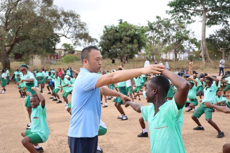 每周二上午,福拉湾学院附中全校齐上武术课,刘伟作为“总教头”,一会儿在前演示“训话”,一会儿在学生队伍中一对一纠正动作。面对活泼好动的学生,刘伟也会不时请他的塞拉利昂徒弟“出山”,作为课堂的“左右护法”。