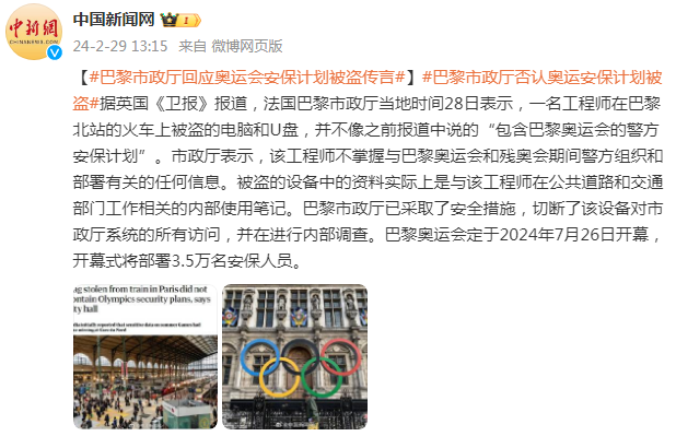据英国《卫报》报道,法国巴黎市政厅当地时间28日表示,一名工程师在巴黎北站的火车上被盗的电脑和U盘,并不像之前报道中说的“包含巴黎奥运会的警方安保计划”。