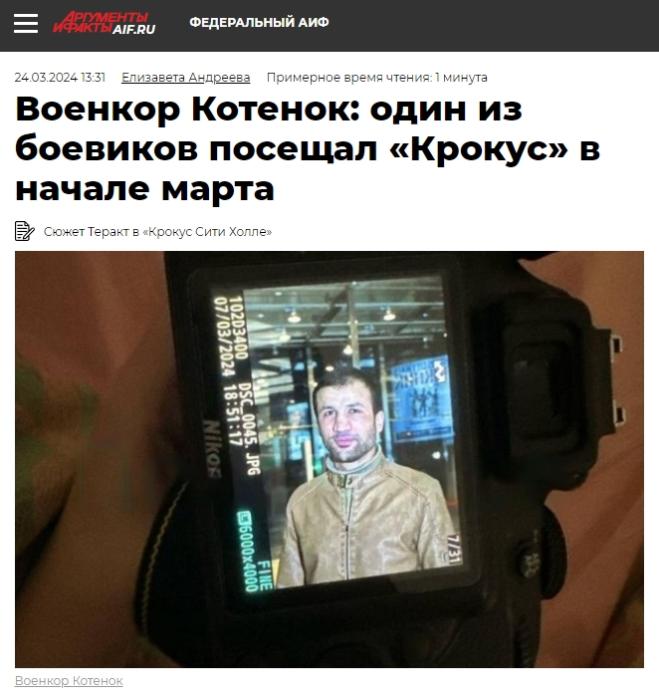 俄罗斯《论据与事实》网站在报道中称,俄罗斯军事记者尤里·科捷诺克在telegram上表示,一名参与袭击“克罗库斯城”音乐厅的恐怖分子曾于3月7日到现场踩点。