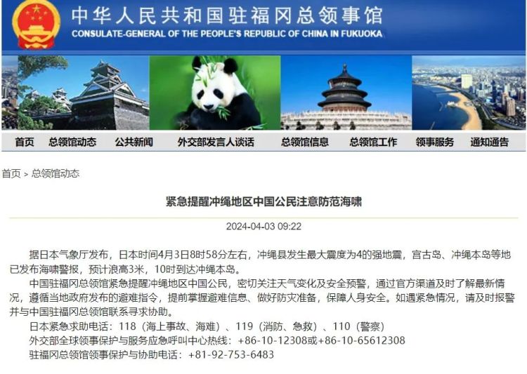 据中国驻福冈总领馆网站消息,日本时间4月3日8时58分左右,冲绳县发生最大震度为4的强地震,日本气象厅随即就冲绳本岛、宫古岛等地区发布海啸警报,提醒该地区人民注意避难。