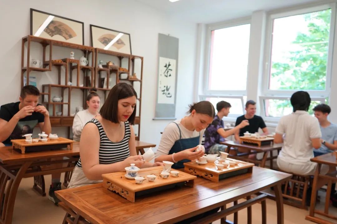 “了解茶文化,学习奉茶和执杯礼仪等,可以把学习中文与了解中国文化融合起来。”马婧每次教学生泡茶前,都会设计一系列问题,比如茶室的起源是什么、茶叶根据什么标准分类、喝茶时主人和客人谁先品尝等,以便帮助学生更好地理解茶道、练习更复杂的语言表达等。自2016年学校设立茶室以来,不少学生在这里学会选茶、洗茶、泡茶、敬茶,爱上了茶的香气和中国文化的韵味。