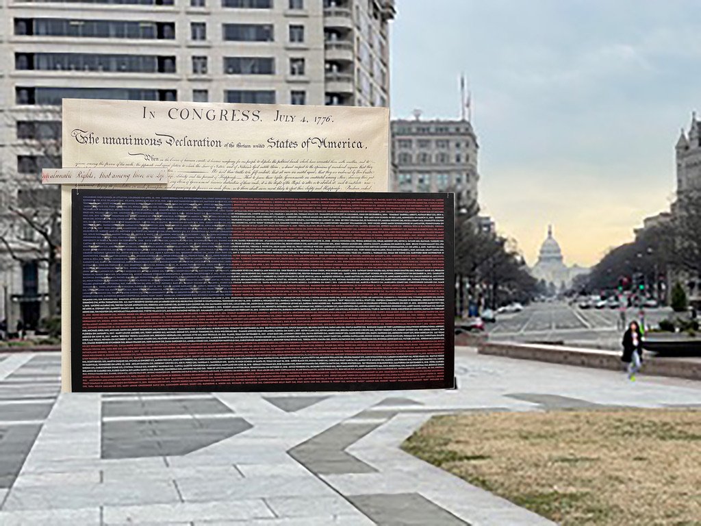 这件名为“可剥夺的生命权”的艺术作品由马里兰州视觉艺术家苏珊娜·布伦南·弗斯滕伯格创作,包含一面巨大的美国国旗,以及其背后的《独立宣言》。其中的“星条旗”图案由1039名在大规模枪击事件中丧生的遇难者的名字绘制而成。《独立宣言》中最著名的条款“人人生而平等,造物主赋予他们若干不可剥夺的权利”的“不可剥夺(unalienable)”一词被放大,并在“不(un)”上打了个红叉,只留下“可剥夺(alienable)”。