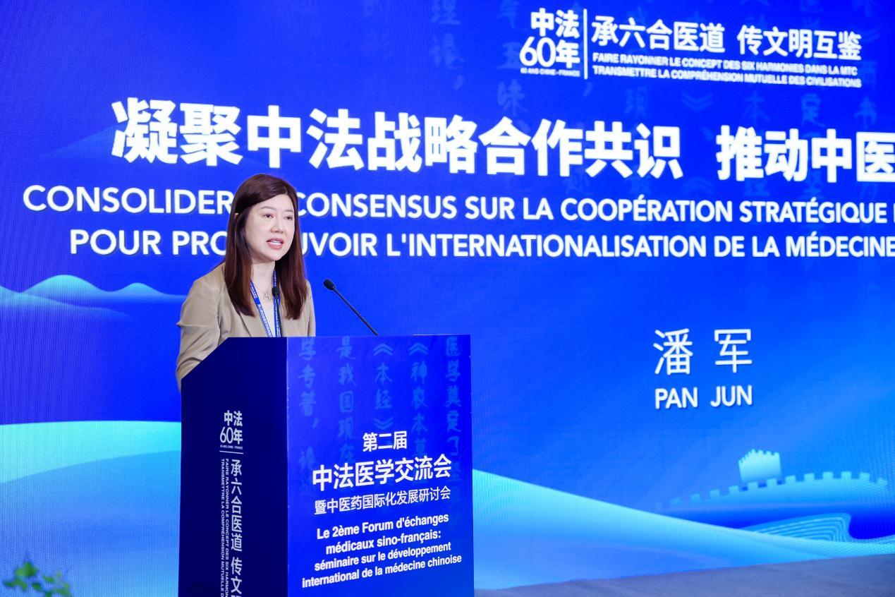 在介绍本次会议基本情况时,她回顾了以亚眠考察为契机促成的2023年首届中法医学论坛,并由此延伸拓展出第二届中法医学交流会的历程。在展望中医药国际化发展前景时,她着重提到了在“文化在地性”理念引领下与住在国国民群体的有效连通,和中医药数字化转型,以及构建国际人才交流双向化、常态化机制的意义。最后她表示,在“独立自主、相互理解、高瞻远瞩、互利共赢”的引领下 中医药国际化未来大有可为。