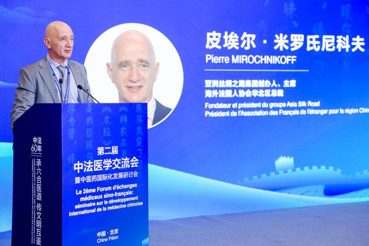 亚洲丝绸之路集团创办人、主席、海外法国人协会华北区总裁皮埃尔·米罗氏尼科夫用“中医不再是神秘的另类疗法,而是通往健康之路的伙伴”这句话诠释了法国人眼中的中医。在致辞中,他提出了“缩小知识鸿沟”“促进理解”“携手合作”的倡议。最后,他希望两国相关领域人士共同努力,迎接中医在全球医疗保健领域占据应有地位的美好未来。