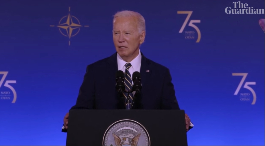 当地时间9日,拜登在北约峰会上宣布美国及其盟友将向乌克兰提供新援助 图源:英国《卫报》视频截图