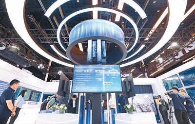 近日,2024全球数字经济大会在北京举行。图为参观者在数字经济沉浸式体验区了解科技产业服务等方面事宜。陈晓根摄(人民图片)