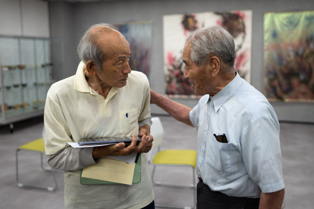 8月10日,在日本长野县饭田市和平祈念馆举行的第35次“为了和平的信州战争展”上,清水英男(右)与日本民间和平团体“为了和平的信州战争展实行委员会”前会长久保田昇交谈。新华社记者张笑宇摄