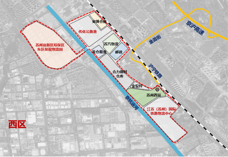 苏州生产服务型国家物流枢纽以国家级示范物流园区——苏州工业园区现代物流园以及三大江苏省级示范物流园区——江苏(苏州)国际铁路物流中心、苏州高新区综保区东区保税物流园、传化公路港为核心载体,按照“一园两区”布局建设,其中,东区位于苏州工业园区,主要载体为苏州工业园区现代物流园,占地面积约3.22平方公里;西区位于姑苏区与高新区,主要载体为江苏(苏州)国际铁路物流中心、苏州高新区综保区东区保税物流园、传化公路港,占地面积约2.92平方公里。在空间布局上,分为五大功能区:定位为国际铁路物流中心、铁路集装箱物流中心、公铁水联运中心的国际多式联运区,定位为保税物流中心、国际物流服务中心、跨境电商物流服务中心的保税物流区,定位为智慧公路港、物流公共配送中心、粮食物流与储备中心的智慧仓配物流区,定位为工业品公共仓储中心、区域分拨分销中心的公共仓储区,定位为制造业供应链物流中心、全球采购分销与分拨中心、医药物流配送中心的国际供应链物流区。