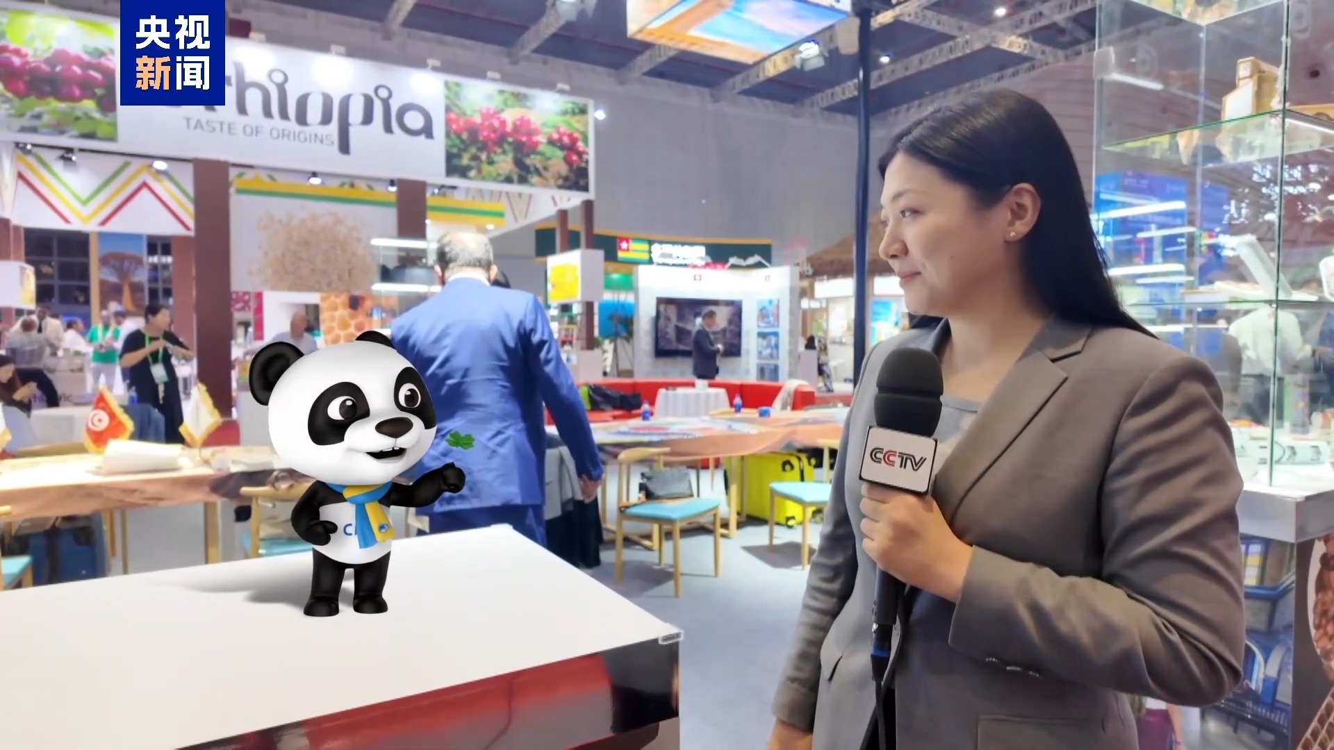 进宝:今天,我要带大家来这里逛点儿不一样的好玩儿的,这是木雕?这是辣椒?这是大猩猩?和我一样胖嘟嘟的呀!这是马里的,这是布隆迪的……我都要看花眼了。从第一届进博会开始,我就为最不发达国家的朋友提供免费展位,今年,来我家里的朋友们更多了。咦?好香的咖啡味儿啊?哈哈,这个一定是我的老朋友方达带来的咖啡,这个背后可有故事呢。
