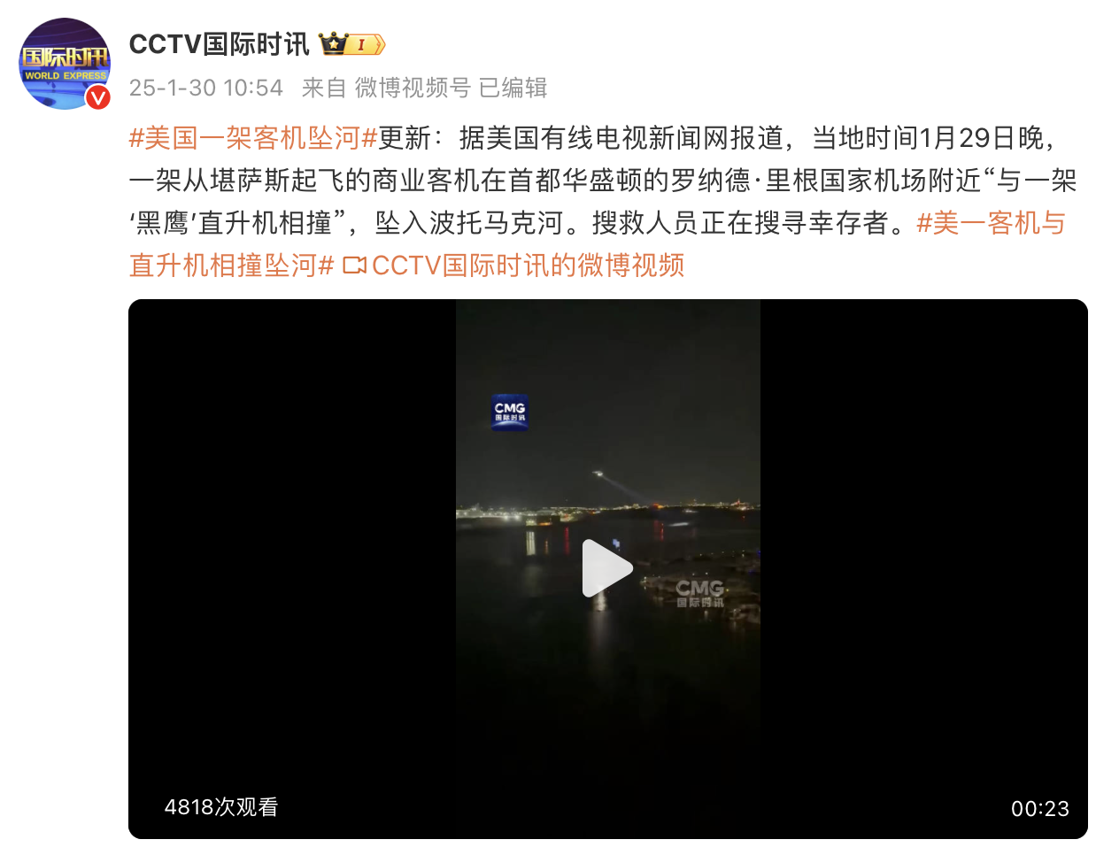 美媒:美一客机与直升机相撞坠河,搜救人员正在搜寻幸存者